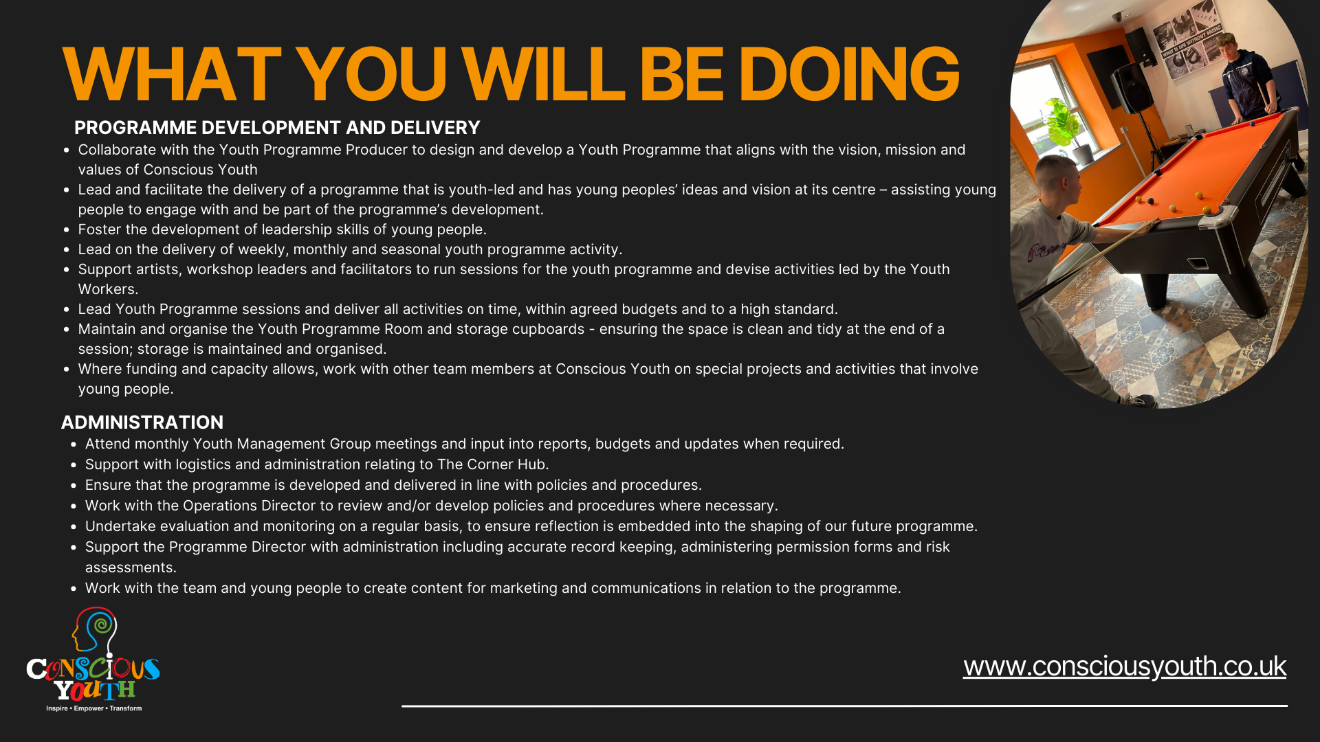 It’s really important to us to nurture a positive and open team culture. We believe in our team, and want everyone to achieve their goals both in and out of work. We support each other. And we believe in Conscious youths’ mission, and the power of youth.