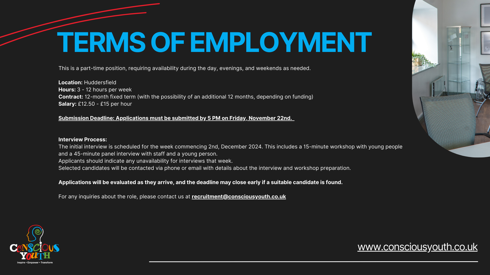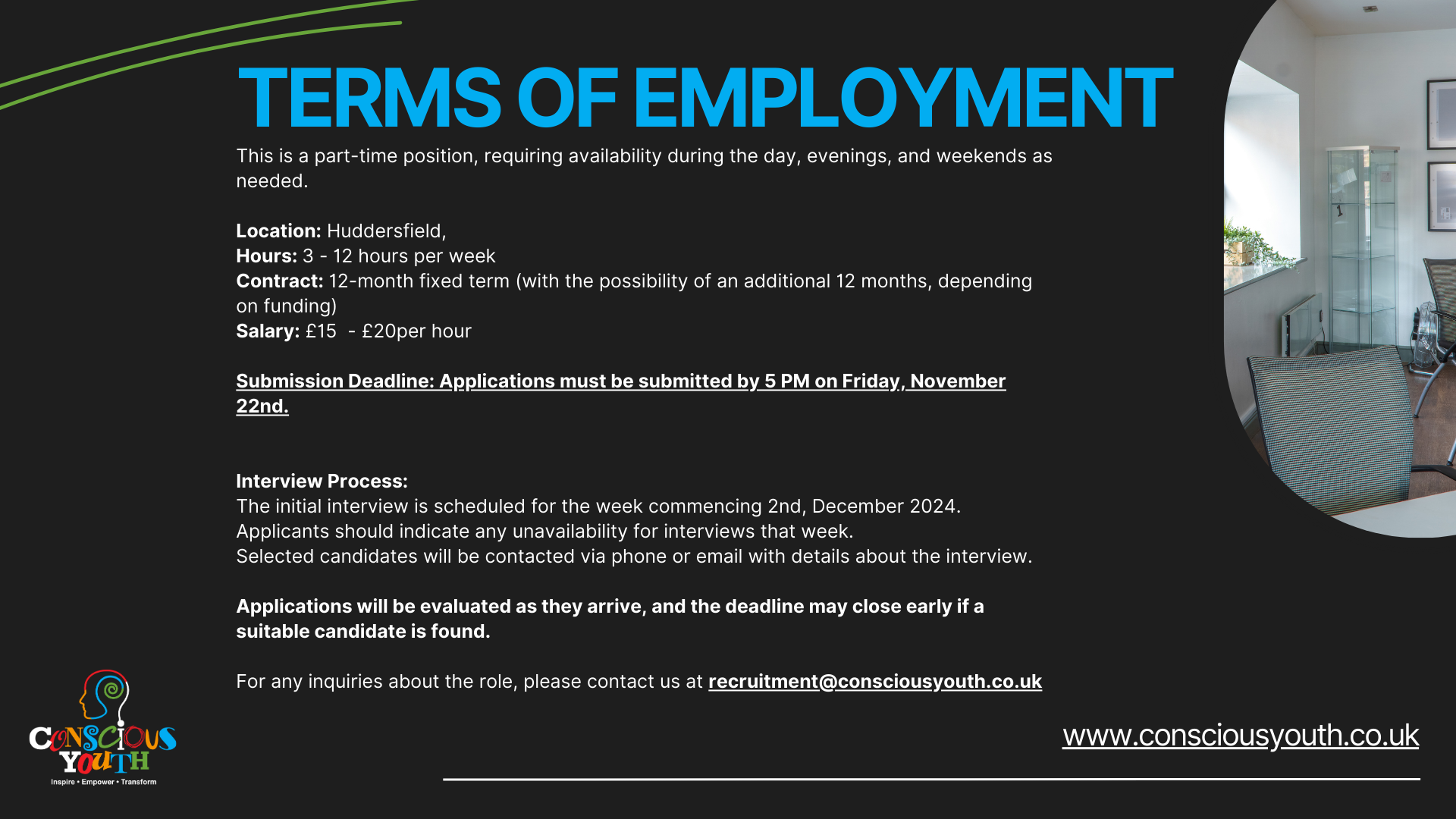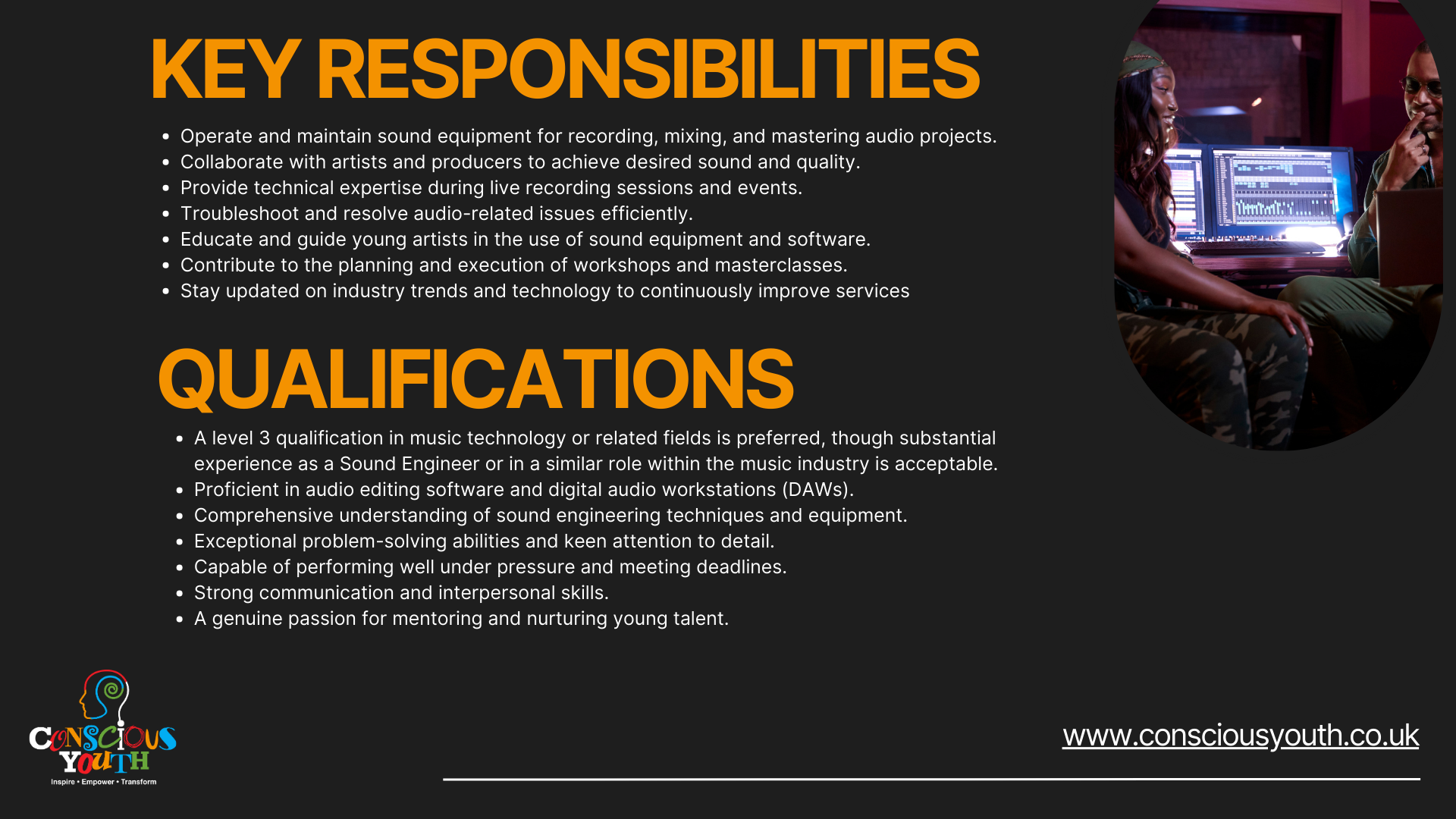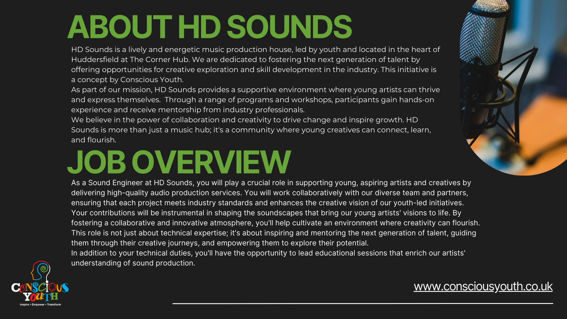 Are you passionate about empowering young people and making a positive impact in your community? Do you have the skills and enthusiasm to inspire the next generation? Conscious Youth is thrilled to announce two exciting part-time job vacancies at The Corner Hub in Huddersfield. We are seeking a Sound Engineer and a Youth Worker to join our dynamic team!